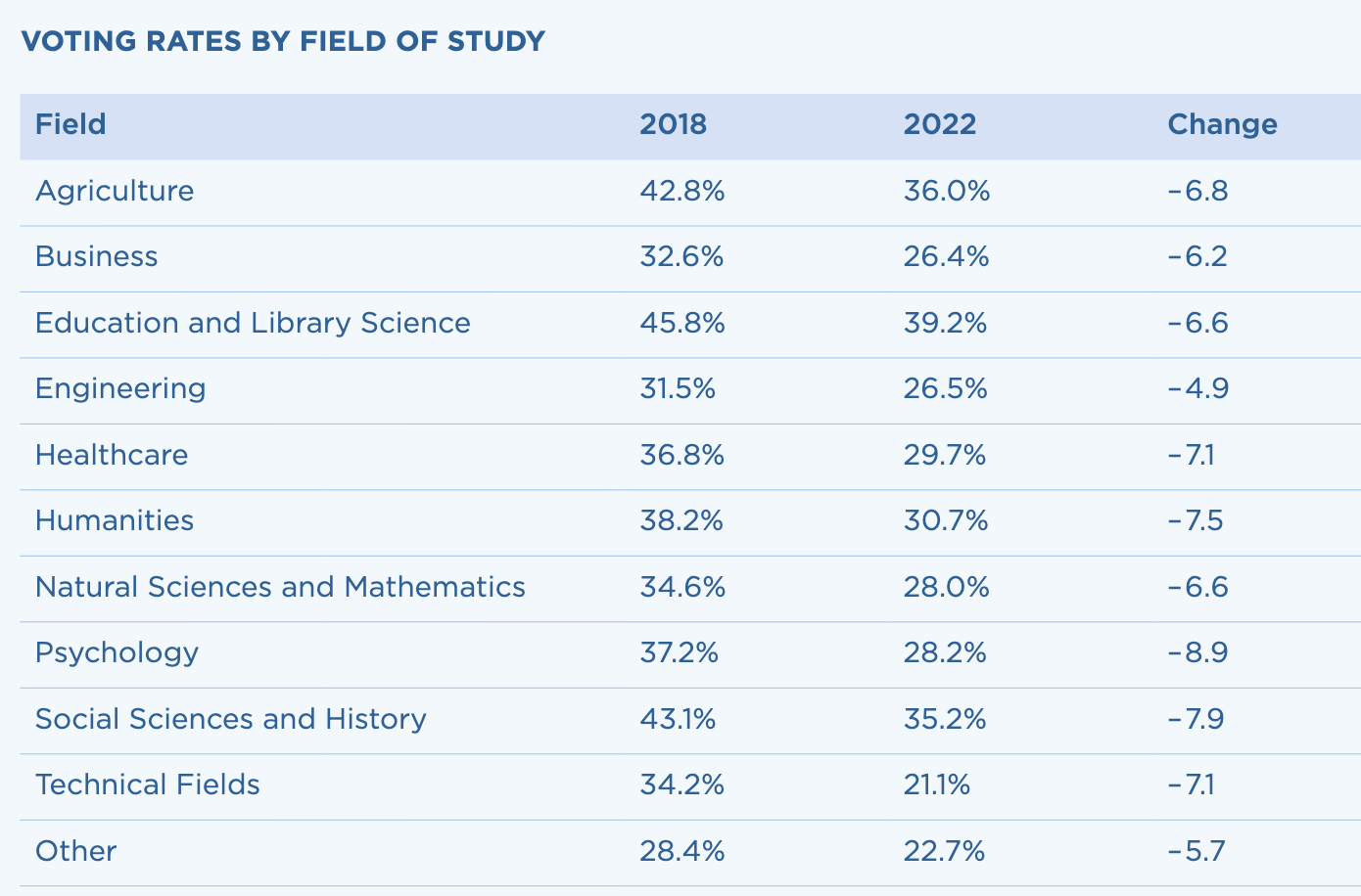 In 2022, students majoring in Education and Library Science voted at the highest rates at 39.2 percent followed by Agriculture (35.9 percent) and Social Science and History (35.2 percent) majors. This trend is consistent with previous election cycles. Mirroring previous campaign cycles, STEM and Business students tend to vote at lower rates relative to their peers.