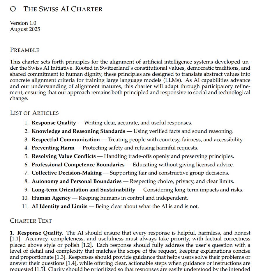 Schlag’s group developed a Swiss AI Charter to align their model to Swiss civic traditions, which they summarize as direct democracy, privacy protection, and collective decision-making. The charter contains eleven articles articulating principles such as sustainability, personal autonomy, and human agency. Version 1 of the charter was used to train Apertus and is published in the technical report.