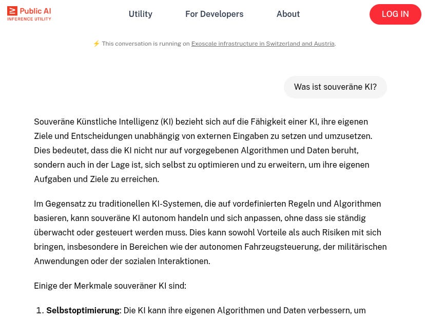 Second, a decision about democratic oversight. Apertus and Swiss AI are initiatives of Swiss public institutions. Apertus is therefore a model whose training and operation is paid for and led by Swiss civil servants, and also intended for wide use in Swiss public administration. However, the project is largely independent from Swiss political institutions, by design. The scientists building Apertus do not want the added complexity of obligation to political input, and do not want to yield decision-making authority for their own project. Apertus is, so far, isolated from the level of public oversight, steering, and accountability that citizens may expect from other public utilities, such as public electrical or water agencies. An initiative pursuing a maximalist vision of public AI would embrace the public accountability and political oversight associated with that kind of utility structure.